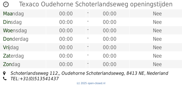 Het is ook mogelijk: Bewerk deze OPENINGSTIJDEN van Winkel Texaco In Oudehorne Schoterlandseweg, Schoterlandseweg 112,,